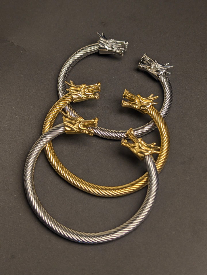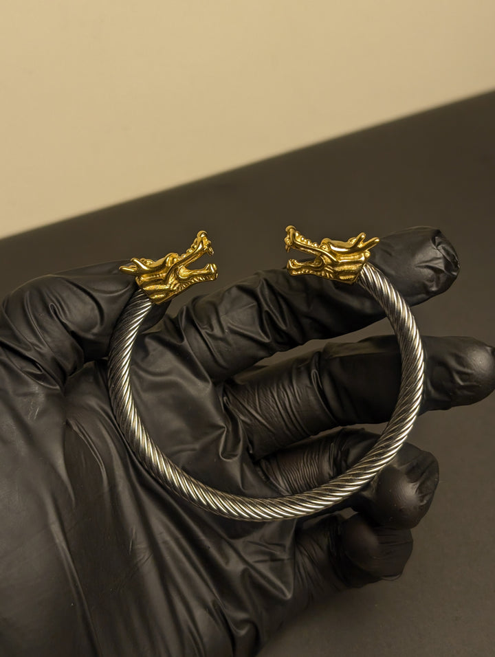 Unleash your inner strength with this Dragon Kara, a powerful blend of tradition and modern design. Crafted from high-quality stainless steel with a twisted cable band, this bracelet features intricately detailed dragon heads on each end, symbolizing power, protection, and courage.